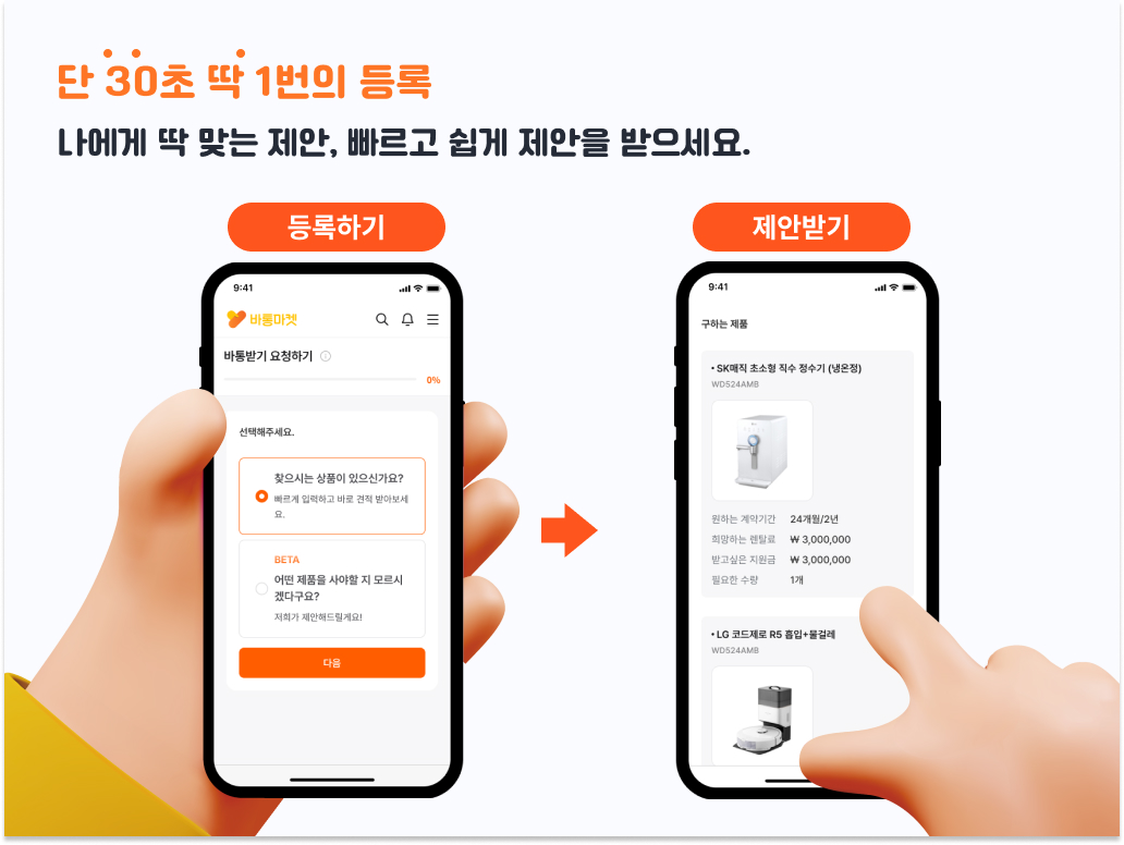 1번의 등록, 단 30초만 투자하면 원하는 렌탈제품을 일일이 찾을 필요없이 양도인과 렌탈사가 제안하는 다양한 제안서들을 보고 내가 원하는 조건과 제품을 고를 수 있어요.