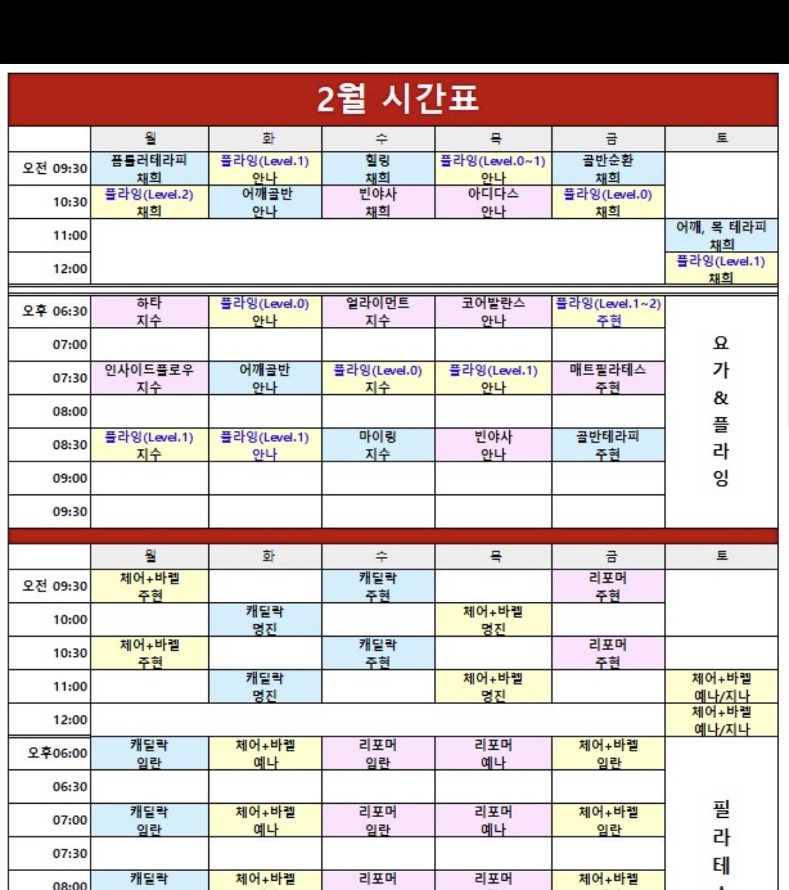 기구필라테스는 어플로 예약하고, 스튜디오는 플라잉를 제외하고 시간표에 맞춰 입장 하여 수업을 들을 수 있습니다.